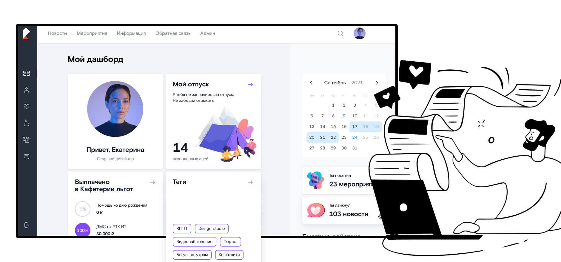 Перед нами стояла задача сделать так, чтобы сотрудники компании могли быстро и удобно получать доступ к информации, находить контакты коллег, планировать отпуск, скачивать файлы, оформлять корпоративные льготы, узнавать новости, посещать мероприятия и выступать на них, благодарить коллег стикерами и оставлять записки. Кроме функциональных задач, была ещё и задача создания активного комьюнити, чтобы ближе познакомить команды друг с другом и поддерживать доверительную среду.